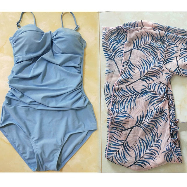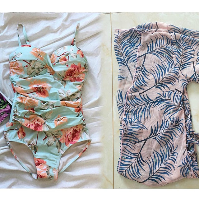 Korean New Women Sexy One Piece Swimsuit body suit Underwire&Padded printing Adjustable shoulder Strap Ruched Slim Bathing suit
