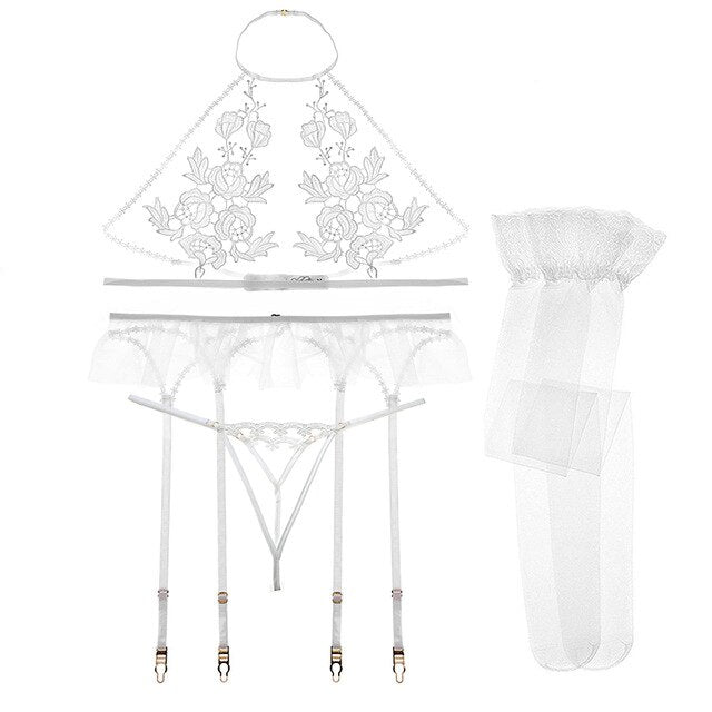 Womens Sexy Lingerie Set Bridal Wedding Sleepwear Embroidery Crochet Lace Nightwear with Veil and Stockings